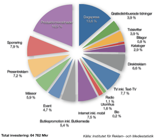 Men detta är inte hela bilden av reklam. Vad diagrammet ovan visar är att 18,9% (12 264 Mkr) av den total investeringen är produktionskostnader och de resterande 81,1 % är mediainvesteringar (32 403 Mkr) och övriga investeringar* (29 094 Mkr). Här saknas en dimension och det är ROI och ROE. Att investera 2 miljoner i dagspress kan aldrig jämföras med 2 miljoner i internet. Och att samla internet i en post är som att slå ihop dagspress, gratisdistribuerade tidningar, Tidskrifter, Bilagor, Kataloger och Direktreklam i en post och kalla det för print.  Vad detta diagram visar är enbart mediainköp och till viss del fördelningen där emellan.